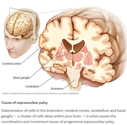 PSP is a disorder that can affect gait, balance, speech, swallowing, vision, eye movements, mood, behaviour and cognition. Life expectancy is typically 5-7 years after diagnosis. The patient with PSP ends up wheelchair and/or bed bound, on a feeding tube (if they wish to prolong their life), unable to speak, and with severely impaired vision or no vision at all. Executive cognitive function is impaired and some patients may develop other forms of dementia such as Lewy Body Dementia or Alzheimer’s. Many patients pass away before the onset of all symptoms due to catastrophic falls and/or aspirational pneumonia.