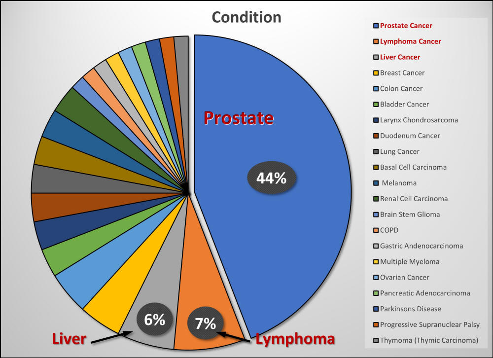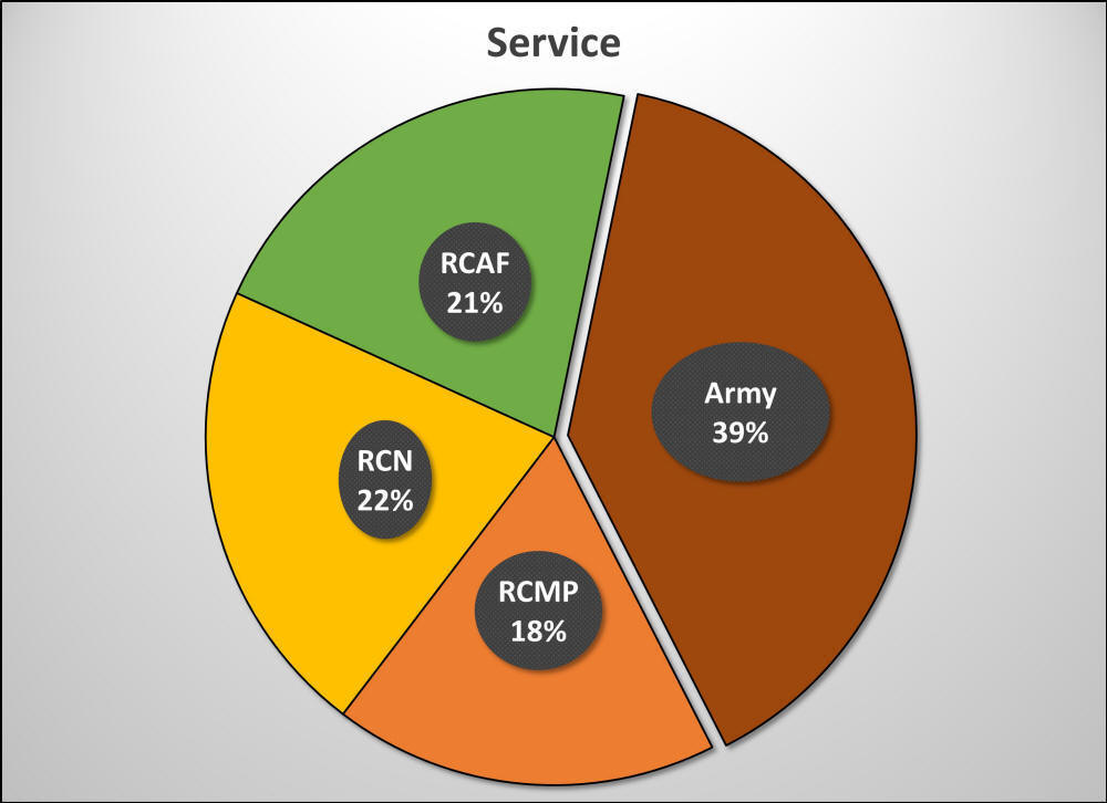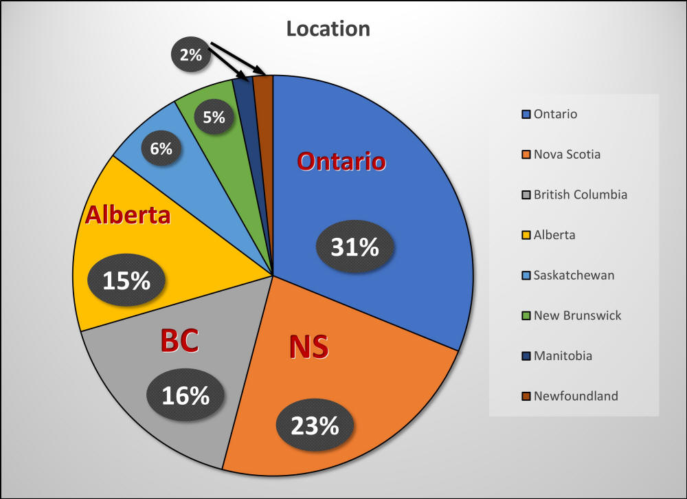 Summary of Activity It's been nearly four months, 121 days, since we first rolled out our website. On average we see in the order of 200 real human visitors (excluding web-bots) per month and 130 veterans have taken the time to register their Cancers and Neurological Diseases in our database. We have had veterans from 8 provinces register. The top four provinces were, Ontario with 31%, Nova Scotia with 23% and BC and Alberta with 16% of registrants each. Of those who have registered 39% were Army, 22% Navy, 21% Air Force and 18% RCMP. Registrants identified 21 different diseases with Prostate Cancer by far the most frequent at 44%. There were thirteen different chemicals identified with Carbon Tetrachloride leading the pack with 63% of the chemical exposures. It's important to note this is by no means a scientific-based survey. Given the small population and the fact that it does not include those veterans who do not frequent the Internet, no conclusions should be drawn from this data. The Pie Charts for each of these stats are shown below.