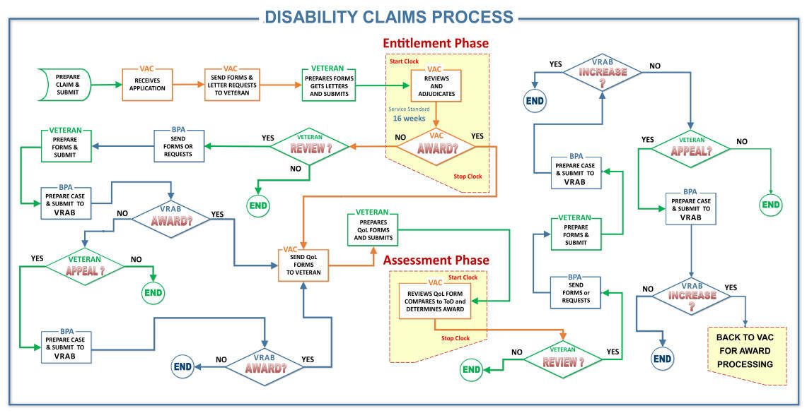 Veterans Affairs Canada (VAC) uses the complex process shown below. When VAC talks about a 16 week process time they are referring to the time it takes to complete the Entitlement Phase only. The total process if Reviews are required takes 3 - 4 years